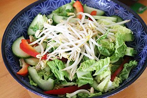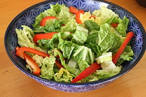 2. Voeg beetje bij beetje de pindakaas toe totdat deze helemaal is opgenomen in de saus. Schenk de sojasaus, water en limoensap er bij en roer door. Laat de dressing een paar min indikken en daarna afkoelen. Snijd de Chinese kool in reepjes. Doe deze in een grote kom. Snijd de paprika in reepjes en de komkommer in halve maantjes en voeg toe aan de kool.