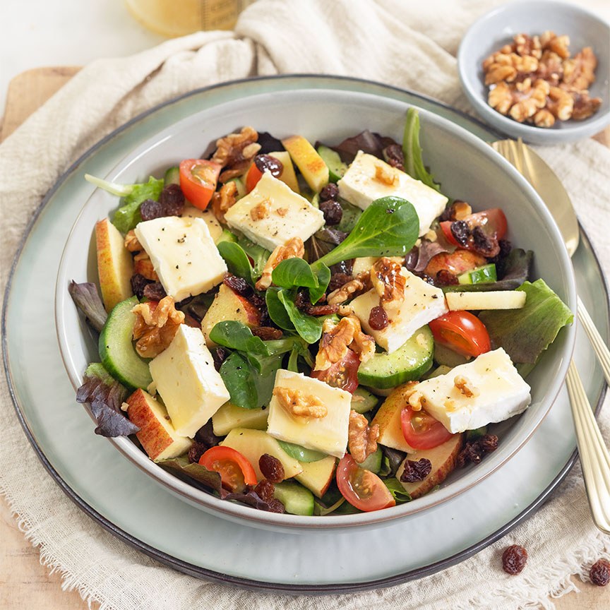 3. Snijd de komkommer in dunne halve plakjes en voeg deze toe aan de kom. Voeg de in blokjes gesneden brie toe aan de salade. Verdeel daarna de gehakte walnoten en rozijnen over de salade.