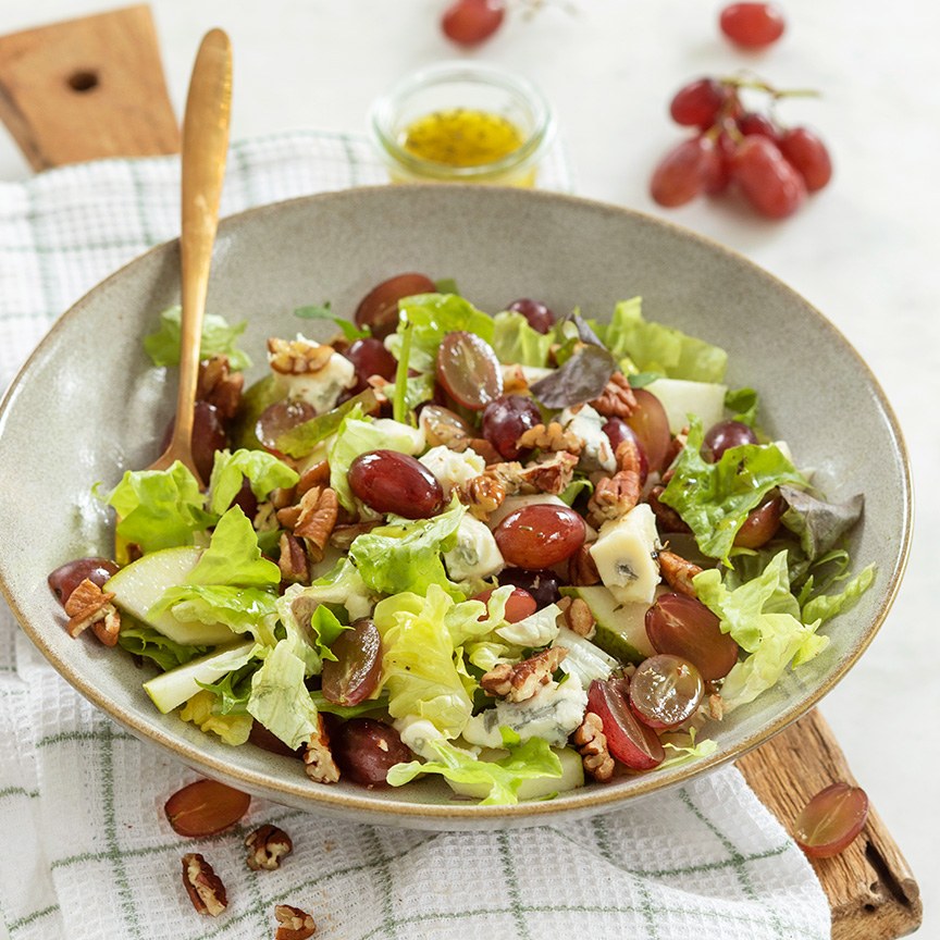 Perfecte combi van sla met zoete druiven, krokante pecannoten en zachte kaas. Lekker als simpele lunch salade of als bijgerecht.