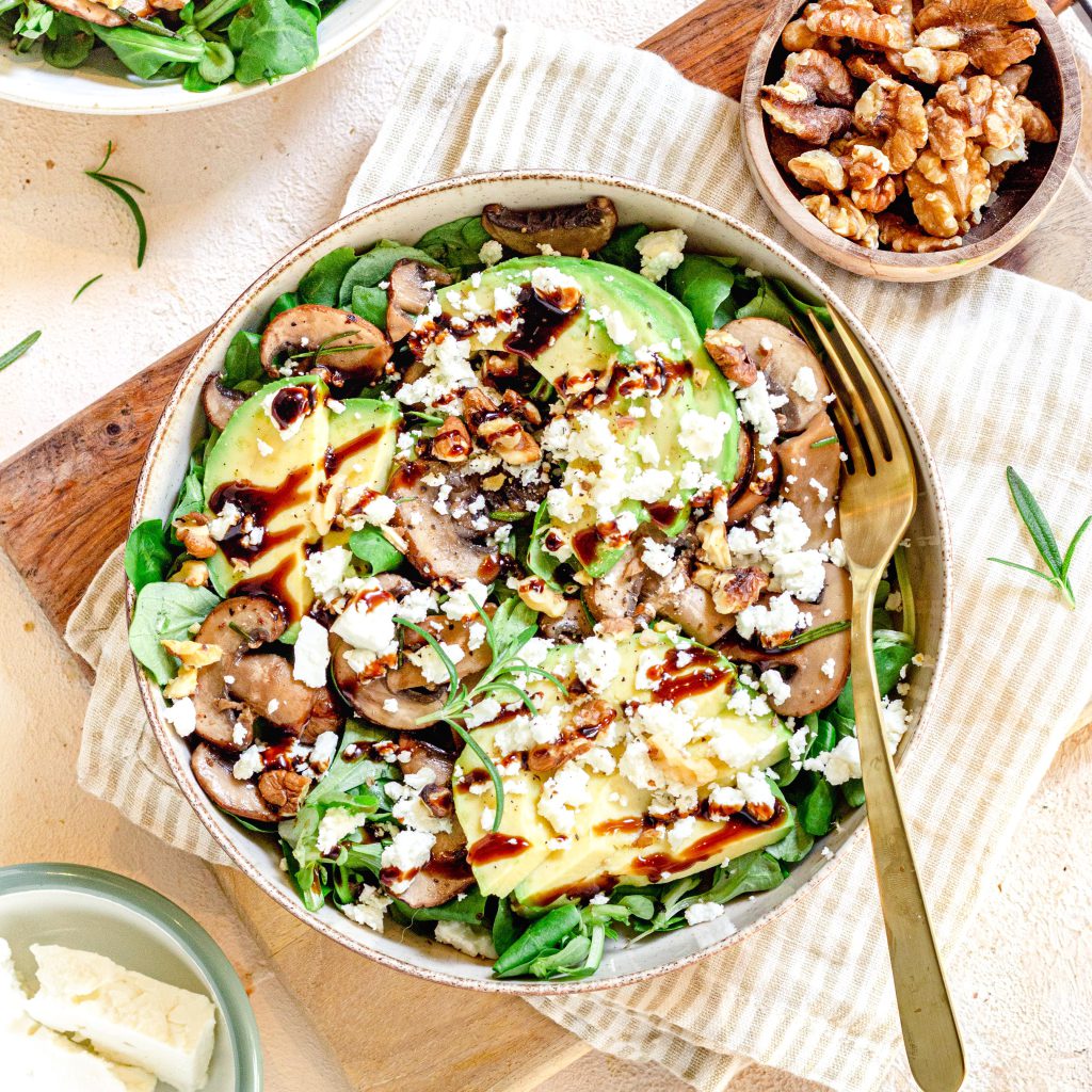 Herfstige salade met in knoflook gebakken champignons met rozemarijn. Lekker met romige avocado, feta, walnoten en balsamico crème.