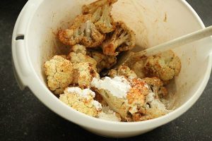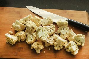 5. Begin vervolgens met de bloemkool. Snijd deze in roosjes en meng samen met de uitgelekte kikkererwten en met de olijfolie (je kunt ook de kikkererwten apart roosteren).