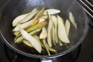 2. Verhit een koekenpan en smelt een beetje margarine of boter. Bak de reepjes peer hierin tot ze een beetje zacht worden.