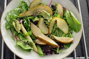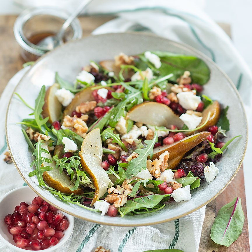 5. Verdeel de sla over borden of kommen. Voeg de gebakken peer, walnoten, geitenkaas en granaatappel toe. Besprenkel met de dressing en hussel nog eens losjes door elkaar.