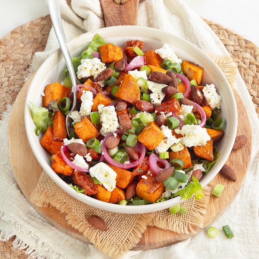 2. Doe de sla in een kom. Voeg de geroosterde zoete aardappels toe met de verkruimelde feta, in reepjes gesneden gedroogde tomaatjes, fijngesneden bosuien en geroosterde amandelen. Voeg ook dun gesneden ingelegde rode ui toe, zorg ervoor dat deze goed uitgelekt is.