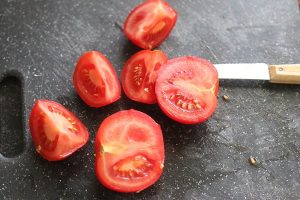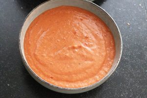 4. Voeg de knoflook, rode wijn azijn, brood, paprikapoeder, olijfolie en een snuf peper en zout toe en mix goed door elkaar.