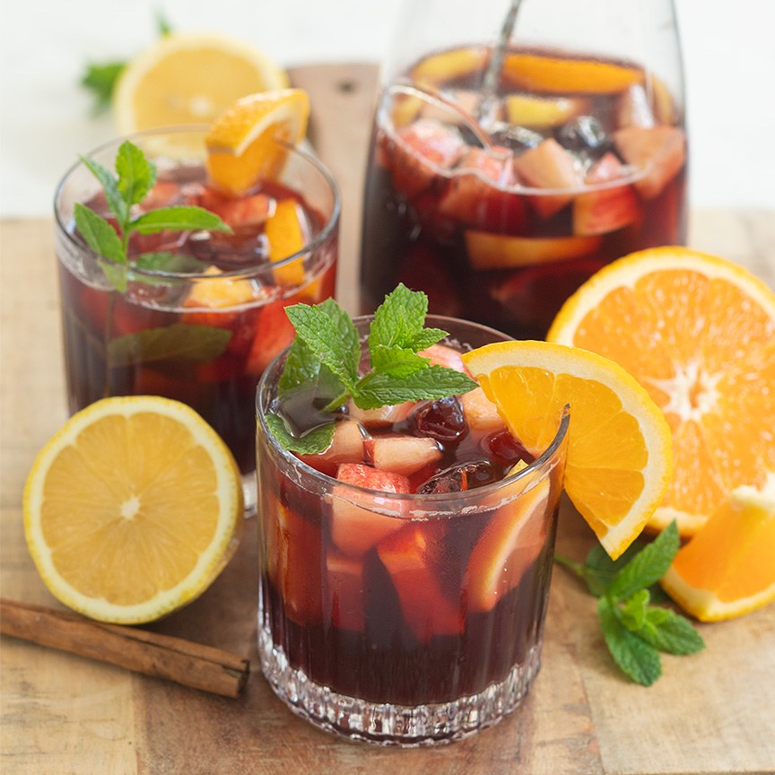 4. Verdeel de sangria over glazen en maak het eventueel af met een schijfje sinaasappel en citroen en een takje munt.
