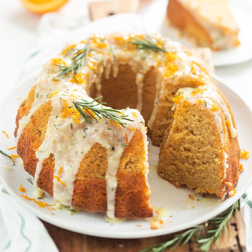10. Giet de topping over de cake heen en bestrooi met de sinaasappelrasp en rozemarijn die je nog bewaard had.