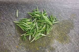 2. Rits de rozemarijnblaadjes van de stokjes en snijd eventuele hele houterige stukjes eraf. Hak de rozemarijn fijn. Bewaar 1 eetlepel voor de topping en zorg dat je ongeveer 2 eetlepels hebt om door het beslag te doen.