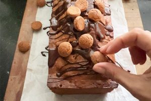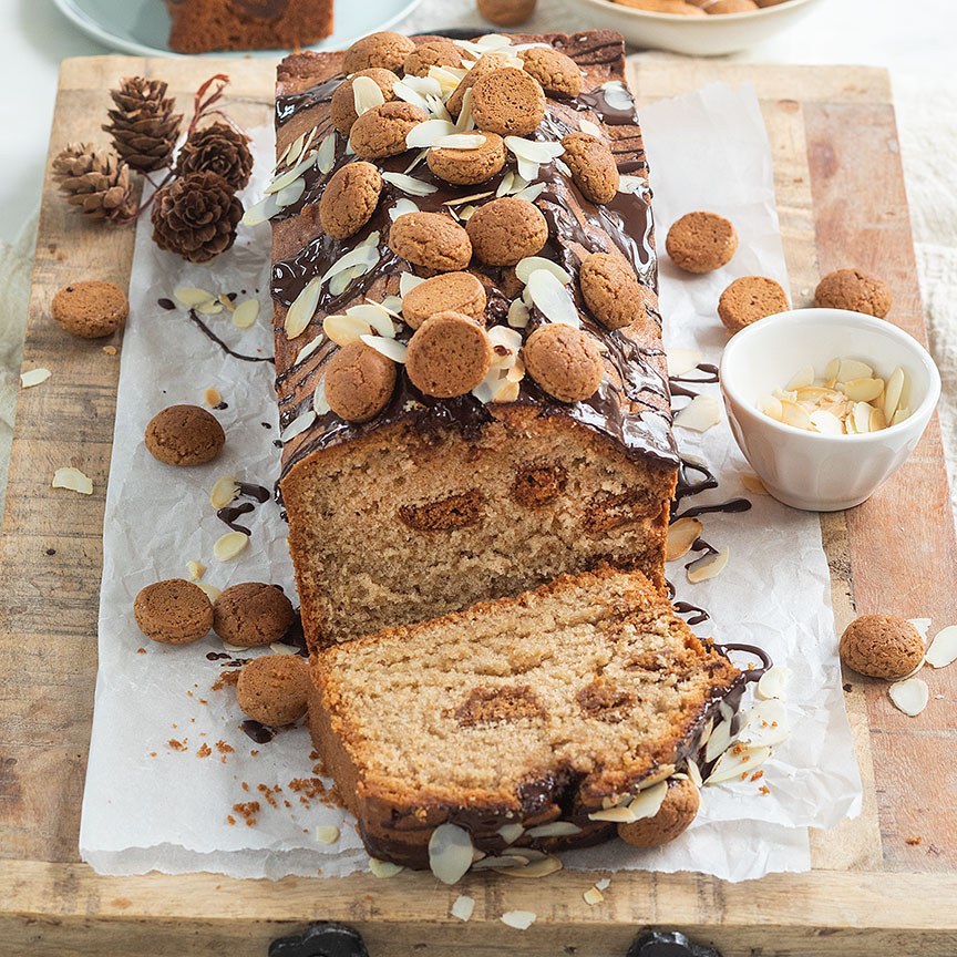 9. Verdeel de chocolade over de afgekoelde sinterklaas cake en verdeel de rest van de kruidnoten er met het amandelschaafsel erover.