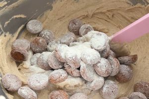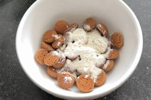 6. Meng ¾ van de kruidnoten met de bloem in een kommetje. Schep deze vervolgens door het beslag.