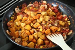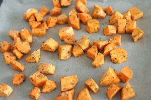 2. Schil de zoete aardappels en snijd ze in blokjes ter grootte van een dobbelsteen. Doe ze in een kom en meng de olie en tacokruiden erdoor. Verdeel ze vervolgens op een bakplaat met bakpapier. Bak ze ca. 20 minuten in de oven tot ze beetgaar zijn.
