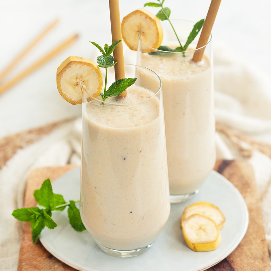 2. Schenk uit in glazen en garneer eventueel met een takje munt en schijfje banaan.
