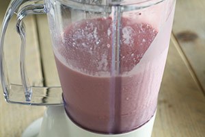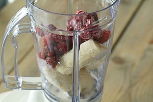 1. Doe het bevroren fruit in een blender en schenk er wat amandelmelk bij. Blend alles door elkaar tot er een gladde smoothie ontstaat.