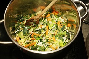 1. Meng het gehakt met de kruiden en draai er kleine balletjes van. Snipper de ui. Smelt de boter in een soeppan. Fruit de ui aan tot deze bruin begint te kleuren. Voeg de soepgroente toe en bak 1 minuutje mee.