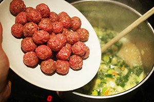 2. Voeg dan het water en de groentebouillon blokjes toe en breng aan de kook. Voeg de gehaktballetjes toe en laat de soep nog 10 minuutjes zachtjes doorkoken.