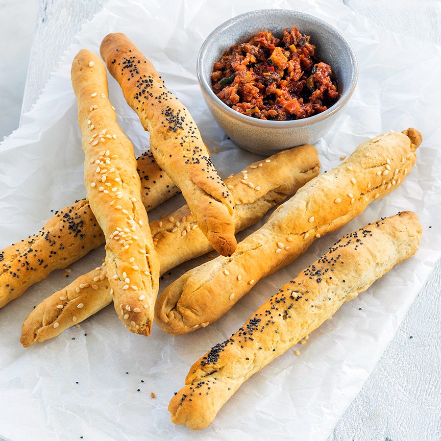 5. Leg de deegstengels op een bakplaat met bakpapier. Bestrijk ze met een beetje water en bestrooi met sesam en/of maanzaad. Bak ze 15 minuten in de oven licht krokant.