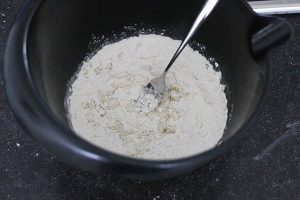 3. Meng tot een deeg. Als het deeg erg droog is, dan voeg je nog een beetje extra water toe. Als het deeg erg nat en plakkerig is, dan kun je wat extra bloem toevoegen.
