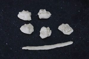 4. Verdeel het deeg in 6 stukjes. Rol ze met je hand uit tot een lange stengel.