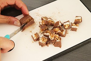 1. Doe de melk in een pannetje en voeg 2 repen Snickers in stukjes toe en laat op laag vuur oplossen. Giet het chocolade mengsel in een zeef en vang de melk op en laat het mengsel geheel afkoelen, zet vervolgens in de koelkast. De opgevangen nootjes bewaar je tot later.