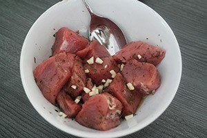2. Snijd de varkenshaas in grove stukken. Pers de knoflook uit of hak heel fijn en voeg toe aan het vlees met een scheutje olijfolie en het citroenrasp.