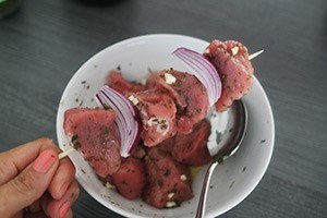 5. Rijg het vlees om en om met de ui aan de prikkers.