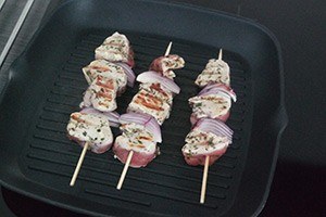 6. Verhit een grillpan of BBQ en bak de souvlaki spiesjes in ca. 5 minuten mooi bruin en nog iets rosé (maar wel gaar) van binnen.