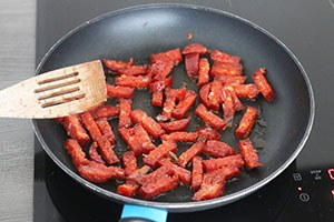3. Snijd de chorizo in reepjes en bak deze knapperig in een een droge koekenpan. Laat daarna uitlekken op wat keukenpapier.