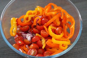 4. Halveer de cherrytomaatjes en snijd de puntpaprika, rode ui en manchego in stukjes.