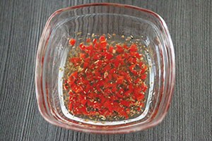 5. Snijd voor de dressing de rode peper heel fijn en meng met de olijfolie, oregano en peper en zout.