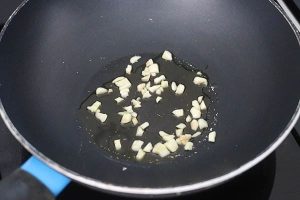 2. Verhit de olie in een pan. Voeg de knoflook en rode peper toe en bak rustig een paar minuten. Het moet niet verbranden en je wil dat de olie de smaken goed opneemt. Giet de spaghetti af en vang een beetje kookvocht op in een kopje.