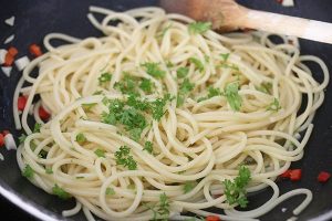 3. Voeg de spaghetti toe aan de olie met knoflook en roer er doorheen. Voeg een beetje van het kookvocht toe zodat het een een beetje smeuïg wordt. Hak de peterselie fijn en meng ook door de spaghetti aglio e olio en breng op smaak met een snufje peper en zout.