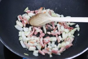 2. Snipper de ui en hak de wortels in blokjes en voeg toe aan het spek.