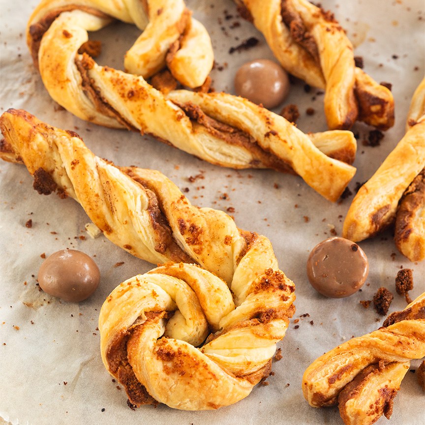6. Klop de melk door elkaar met de speculaaskruiden. Besmeer de bladerdeegstengels in de vorm van een staf hiermee. Strooi de overgebleven koekkruimels er over.