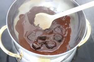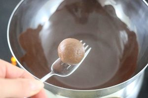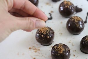 2. Smelt de chocolade au bain marie in een kom boven een pannetje met heet water. Rol de speculaasballetjes kort hier door en haal er uit met een vork en laat iets uitdruipen en leg dan op een plank met een stuk bakpapier. Bestrooi de bovenzijde met wat bewaarde speculaaskruimels. Zet ze dan in de koelkast en laat nog een uurtje opstijven.