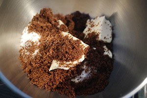 1. Verwarm de oven op 170 graden. Gebruik 10 gr van de boter om de cakevorm in te vetten. Mix met een mixer de andere 240 gr boter met de gewone suiker, de basterdsuiker en de vanillesuiker tot een romig mengsel.