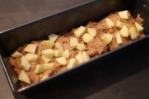 2. Voeg een voor een de eieren toe tot ze zijn opgenomen. Meng het cakemeel met de koek en speculaaskruiden. Zeef dit bij het romige beslag en mix nog een minuutje door elkaar. Schil de appel en snijd in stukjes. Verdeel de helft van het beslag in de ingevette cakevorm en verdeel de stukjes appel er over.