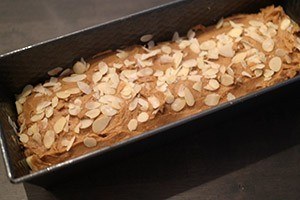 3. Schep de rest van het beslag er bovenop en bestrooi met de amandel. Zet de cake ongeveer 55 min in de oven. Als hij te donker wordt kun je de cake afdekken met aluminiumfolie. Controleer altijd met een satéprikker of hij gaar is van binnen.