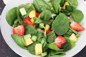 2. Verdeel de spinazie over 2 borden. Schep hier wat komkommer, mango en aardbeien over. Besprenkel met de dressing. Leg de kaasschnitzel hierop en bestrooi met amandelschaafsel. Serveer de salade lauwwarm.
