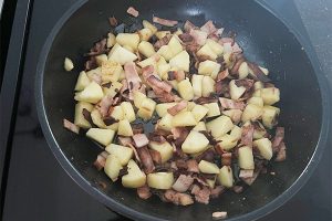 3. Verhit een koekenpan en bak de reepjes spek licht krokant.
