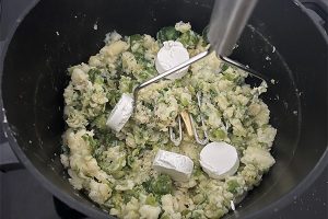 5. Giet de spruiten en aardappels af en doe terug in een pan. Stamp ze fijn met een stamper.
