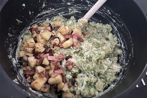 Prima recept, met vegaspekjes gemaakt want ik eet geen vlees. Advies is om dan de appelstukjes er meteen bij te doen, want de spekjes zijn zo snel klaar, dat de appel onvoldoende bruin gebakken was. Daardoor wel lekker knapperig gebleven.. 😉
