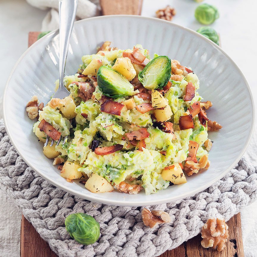 7. Schep het spek en appelmengsel samen met de geitenkaas door de spruitjesstamppot en breng de stamppot verder op smaak met peper en zout. Doe als laatste de walnoten erdoor.