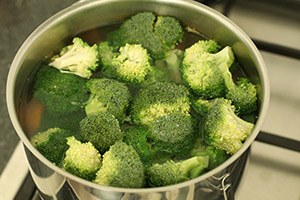 1. Schil de zoete aardappels en snijd ze in grove stukken. Breng een ruime hoeveelheid water aan de kook en kook de zoete aardappelstukjes in 15 minuten gaar. Snijd ondertussen de broccoli in roosjes en voeg deze de laatste 5 minuten toe.