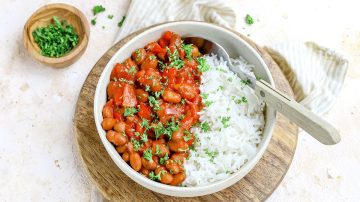 3. Verhit water in een pan. Halveer de paksoi en blancheer deze kort in de pan, ca. 1 a 2 minuten. Serveer de rijst op een bord met de sticky champignons en de paksoi. Bestrooi met wat cashewnoten en eventueel wat extra rode peper.