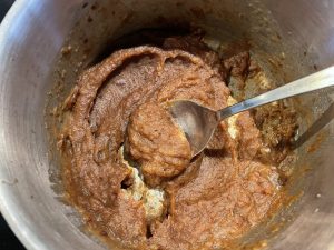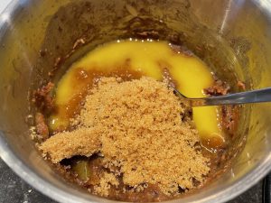 5. Meng met de gesmolten boter, bruine suiker eieren, glutenvrij meel, bakpoeder en snuf zout.