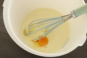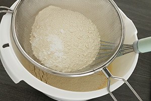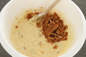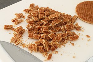 1. Verwarm de oven op 190 graden. Doe de slagroom in een kom en voeg de suiker toe. Klop met een garde (of kort met de mixer) doorelkaar. Kluts de eieren erbij en mix er ook door. Zeef het bakmeel en bakpoeder bij het natte mengsel en spatel er kort door. Leg 6 mini stroopwafels apart en hak de rest grof. Voeg de gehakte stroopwafels toe aan het beslag en schep er kort doorheen.