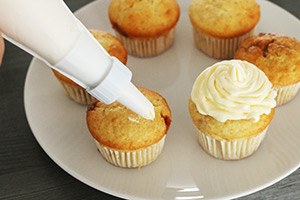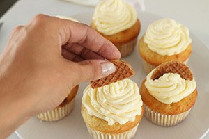 3. Doe de botercreme in een spuitzak en maak toefjes op de stroopwafelmuffins. Halveer de overige stroopwafeltjes en steek deze in de toef. Bedruip als laatste wat karamelsaus er over als deze is afgekoeld. Bewaar de muffins afgesloten op een koele en droge plek, maar niet in de koelkast max 2 dagen.