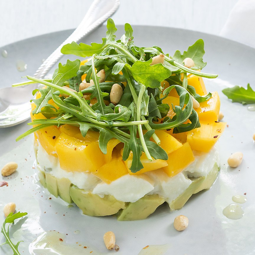 1. Meng de ingrediënten voor de dressing goed door elkaar. Snijd de mango en mozzarella in kleine blokjes. Halveer de avocado’s, verwijder de pit en schil en snijd het vruchtvlees ook in kleine blokjes (besprenkel eventueel met een beetje limoen of citroensap om verkleuring tegen te gaan). Leg een kookring op een bord en verdeel daar ongeveer een kwart van avocado in, druk zachtjes iets aan.