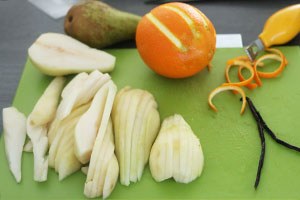 1. Verwarm de oven voor op 200 graden. Verwijder het klokhuis van de peren en snijd in dunne plakken. Snijd een aantal schillen van de sinaasappel. Plak de plakjes bladerdeeg aan elkaar vast. Halveer het vanille stukje en rasp het merg eruit. Verhit nu de pan waarin de karamel gemaakt wordt. Wanneer deze heet is, voeg je de suiker hieraan toe en laat je dit op middelhoog vuur smelten. Wanneer de suiker begint te smelten voeg je de boter in stukjes toe. Kijk uit, je mag met de pan bewegen, maar niet in roeren.