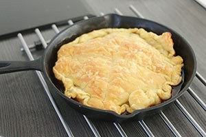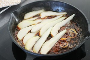 2. Wanneer dit gesmolten is, voeg je de sinaasappelschillen toe, het merg van het vanillestokje, takjes tijm en ook de peren. De peren leg je dakpansgewijs in de pan. Laat dit nog ongeveer 2 minuten op staan en zet dan het vuur uit. Nu mag je de tarte tatin dichtmaken door de plak bladerdeeg er overheen te leggen. Het hoeft niet netjes te zijn aan de zijkanten. Deze tarte tatin mag nu ongeveer 25 minuten in de oven op 200 graden of tot het bladerdeeg goudbruin is.
